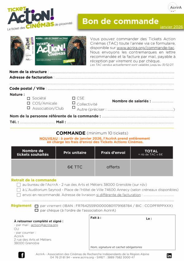 Nouveauté : L’AcrirA prend désormais en charge les frais d’envoi des Tickets Action Cinémas.